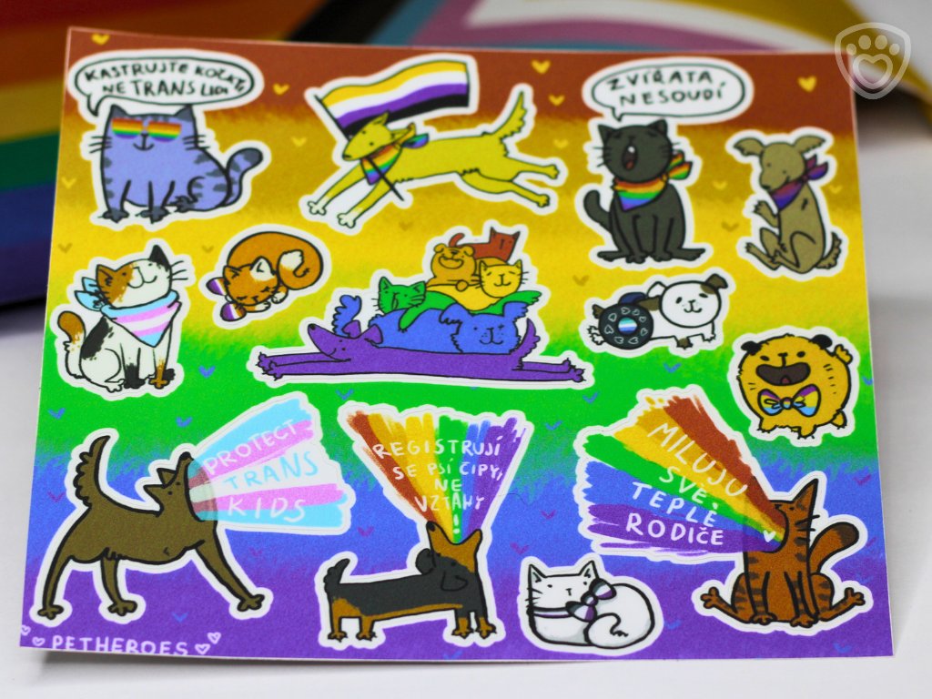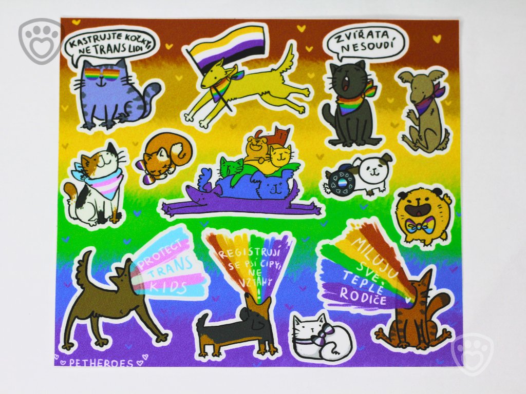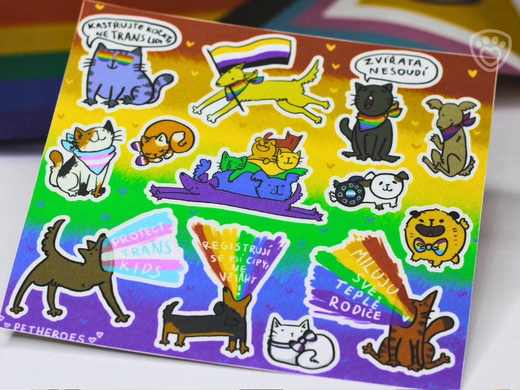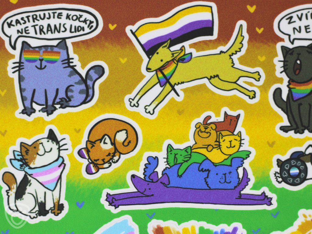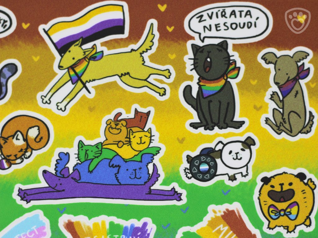 Samolepky pro milovníky zvířat, pro všechny z LGBT+ komunity a jejich spojence! Každá samolepka psa či kočky je jiná, ale ať už zahrnuje pride vlajku nebo jiné LGBT+ symboly, všechny přináší do každodenního života barvy. Můžete je použít jako samolepky do diáře, na notebook, nebo si jimi ozdobit cokoliv vás napadne. Láska a přijetí vypadá krásně všude!